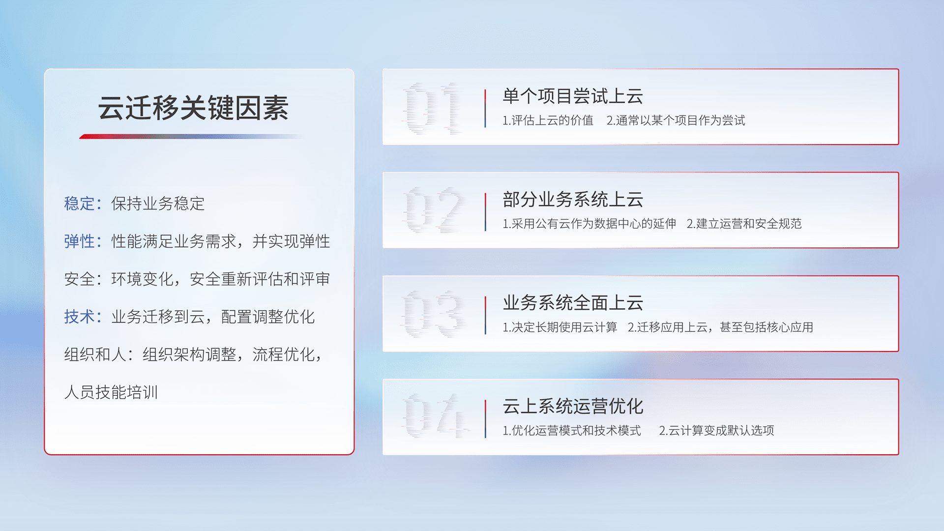 结合实际业务,,从规划设计、、、云平台选型、、云原生改造、、、数据迁移、、、、集成交付,,,,迁移全过程为客户识别最佳上云路径,,做好风险识别管理,,,设计网络架构、、、身份权限、、、安全审计合规、、、操作审计、、日志审计、、、监控告警策略、、、、多站点容灾设计等,,,,对云上基础设施进行整体规划,,,,提升IT治理水平,,以满足弹性、、、、高可用、、、、高性能的需求。。。